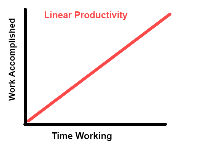 Most of us, for most of our lives, conceptualize work as a linear function. What I mean by “linear” is that the amount of productive output you create is directly proportional to the number of hours you input.